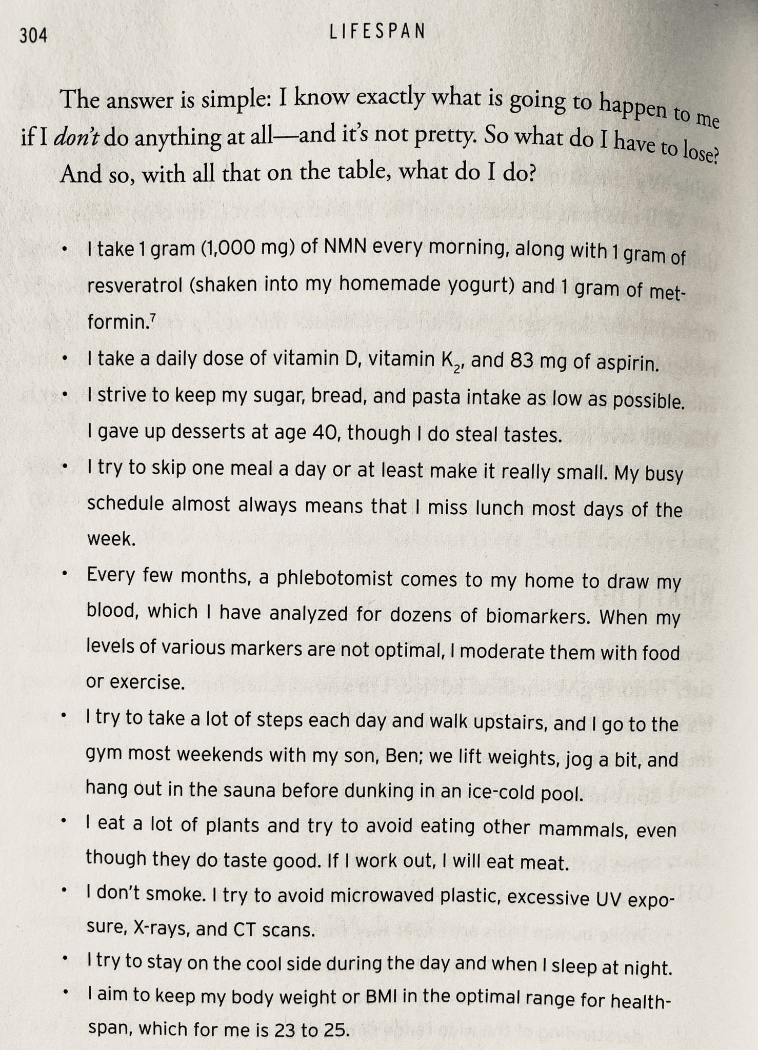 For example in his book Lifespan he mentions on page 304 that he takes NMN and resveratrol every morning often mixed in his yogurt. Nicotinamide Mononucleotide NMN 1g per day in the morning. The Key Ideas in Detail Premise of the Book.
